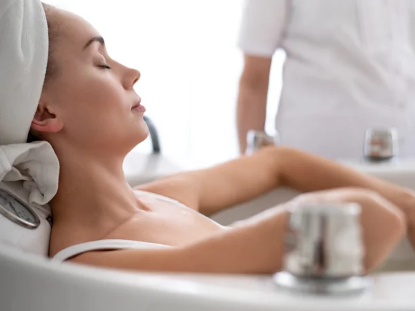 Kombinacija učinka tople vode in masaže z vodnim curkom za izboljšanje krvnega obtoka in sprostitev.
